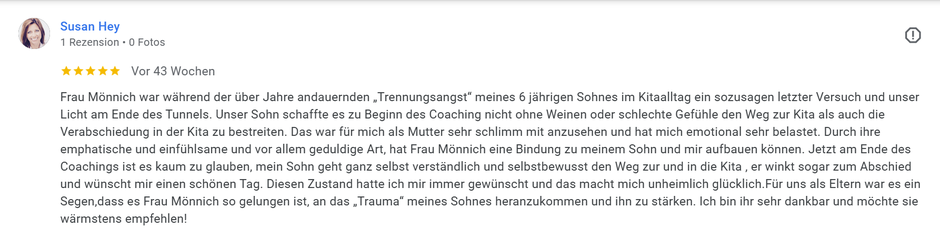 Frau Mönnich war während der schlimmsten Angstperioden meiner 10-jährigen Tochter unser Licht am Ende des Tunnels.Unsere Tochter schaffte es zu Beginn des Coaching nicht mehr, die Schule zu besuchen.Durch ihre so emphatische und einfühlsame Art,hat sie sofort eine Bindung zu meiner Tochter aufbauen können und bereits nach der ersten Sitzung hat sie es am nächsten Tag wieder in die Schule geschafft.Für uns als Eltern war es ein Segen,dass es Frau Mönnich so schnell gelungen ist,das Nervensystem unserer Tochter zu beruhigen und sie zu stärken.Wir sind ihr sehr dankbar und möchten sie wärmstens empfehlen!